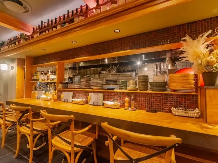 店内は木を基調とした、くつろげる空間。落ち着いた雰囲気で気兼ねなく立ち寄れます。カウンター席では、ピッツァが窯で焼かれる様子や料理が仕上がっていく様子がライブ感たっぷりに楽しめます。自然派ワインをはじめクラフトジンやビール、日本酒、焼酎などもそろっているので、ゆっくり一人飲みを楽しむのも良いですね。