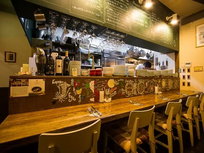 地下に構えたお店は、まるで隠れ家のよう。ブラウンを基調とした店内は、肩肘張らずにくつろげる空間になっています。カウンター席からは調理する様子を間近に眺められ、シェフとの会話も楽しめます。お一人様でも気兼ねなく過ごせる雰囲気なのもうれしいところ。ワインを片手にゆっくり過ごす、至福の時間が過ごせます。