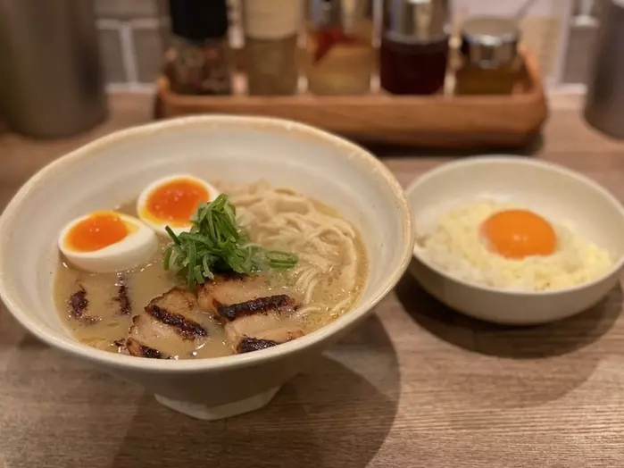 京都の銘柄豚「京都ポーク」の豚骨と数種類の野菜をこれでもか!というほど煮込むことで、濃厚でコク深いスープに仕上がっているとのこと。極太の平打ち麺との相性も抜群です。味変用の焦がしニンニク油を入れると香ばしさが加わり、また違ったおいしさを楽しむことができます。