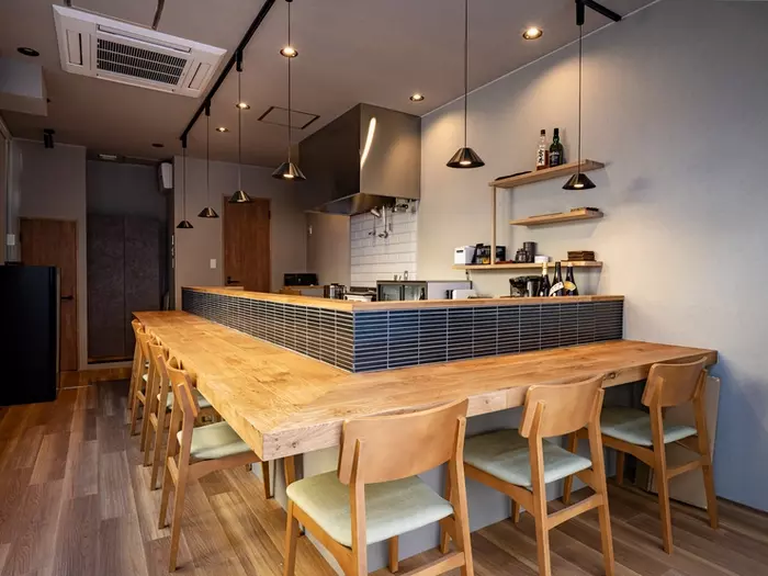 東長崎駅から徒歩3分の場所にある【鮨ひがし】。2025年春のオープン以来、地元を中心にファンを増やし続ている江戸前寿司店です。「入りやすくて通いやすい、普段使いできる寿司店」がテーマの店内は、高い天井とペンダントライトが印象的なカフェ風の佇まい。オーク材のカウンターに7席のみが配された、くつろぎ空間です。
