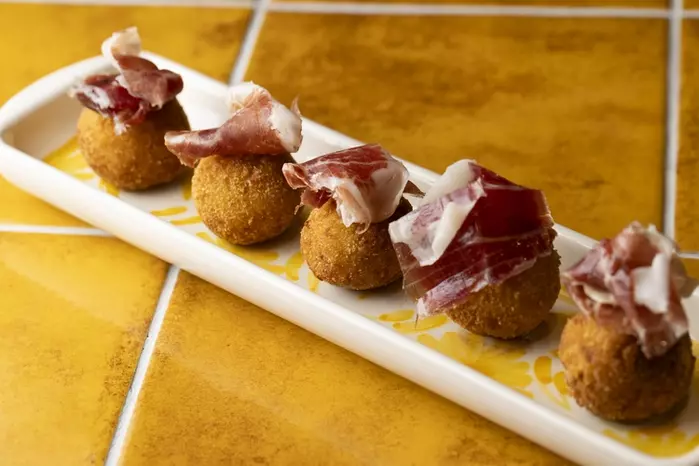 看板メニューのひとつでもある、スペインの定番『ハモン クロケッタス』(1,500円)。ハモンの旨みをとじ込めた特徴的なベシャメルソースをじっくり丁寧に仕込み、なめらかな口あたりと豊かなコクに仕上げた【Atrevío】を代表する一皿です。