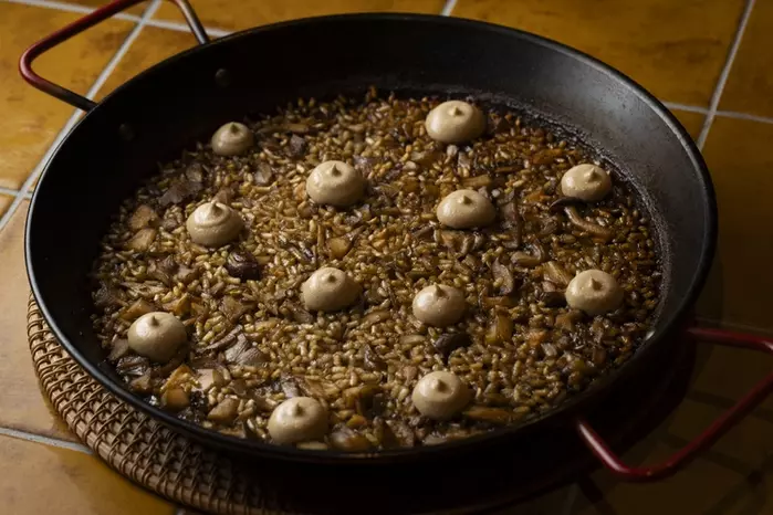 『トリュフ パエリア』(4,600円):ハモンの出汁とドライきのこで炊き上げた季節の「パエリア」も【Atrevío】自慢の一皿。