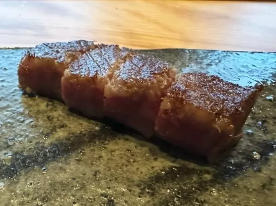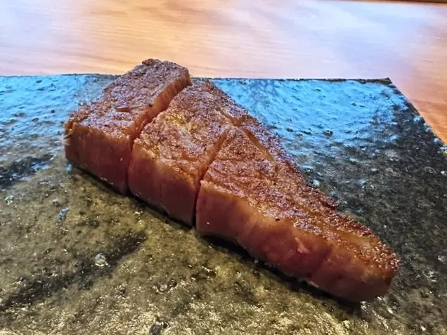 メインの肉は黒毛和牛が2種類、香川のサーロインと鹿児島のヒレ。それぞれの脂の具合に応じて、手元の調味料で味を調整していただきます。ボルドーの赤を合わせてもらいます。