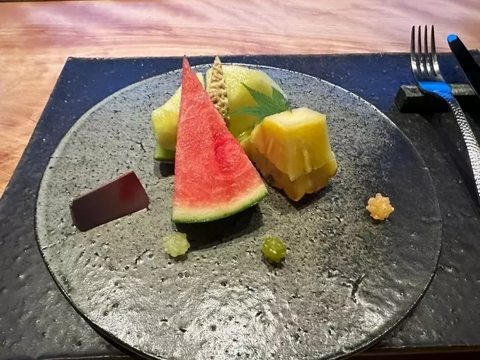 デザートは高知の有名なマスクメロンの一果相伝、島根のスイカ、 オリジナルのい無花果ガナッシュなどに金平糖があしらわれています。