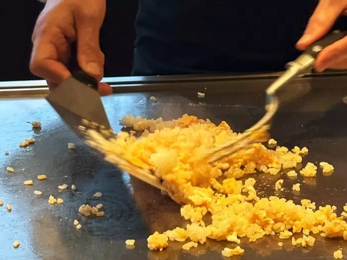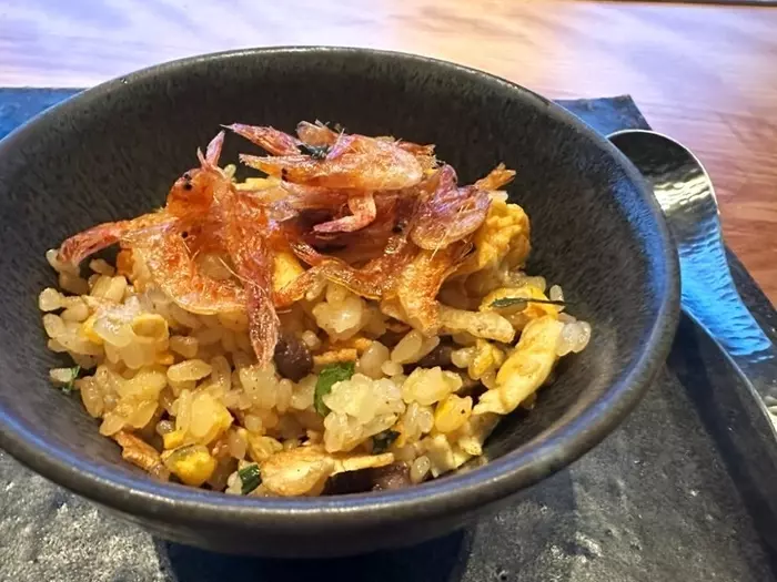 最後は、ガーリックライスです 目の前で 駿河湾の桜えびが炒められます 香りがすごく立ち上がります。そして紫蘇入りのもろみの焦がし醤油。この香りでまたお腹が減りますね。