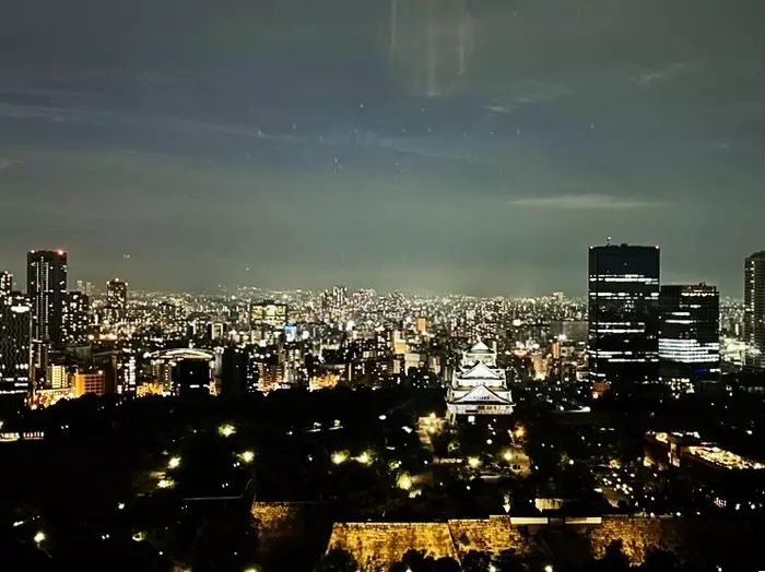 ライトアップされた大阪城が公園の闇の中で浮かび上がって見えます。