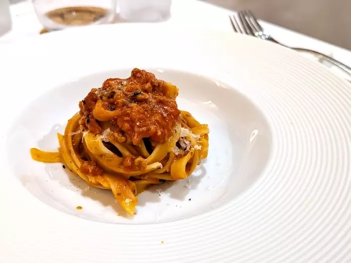 旨みがぎゅぎゅっと詰まったボロネーゼ。大豆のお肉の満足感にも驚きます※画像はメディア向けレセプション時のもの。通常サイズの1/2となっています