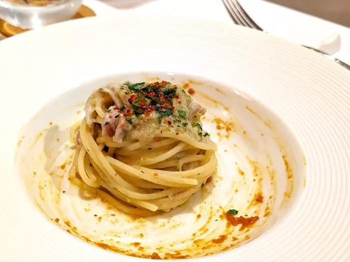 『豚バラ、アサリ、茄子 スパゲッティアーリオオーリオ仕立て』