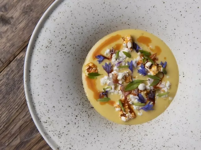 メキシコの屋台フード「エスキーテス(焼きとうもろこしの和え物)」を久松シェフ流にアレンジしたスープ料理。香ばしく焼いたトウモロコシの甘みと香りをベースに、メキシコ料理らしいチリオイルのピリ辛さがアクセントを加えます。ライムの酸味や、チーズのまろやかさで深みのある味わいに。