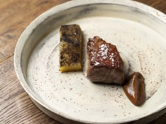 滋賀県・サカエヤの熟成経産牛に、2年熟成のメークインを薄く重ねて焼き上げたポムアンヌを添えた一皿。