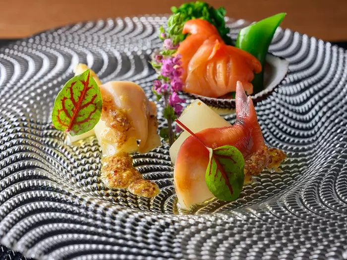 メニューは、完全予約制の『季節の特別コース』のみ。日本各地から届く旬の産直食材や、地元産の新鮮野菜、極上の黒毛和牛などこだわりの食材を用いて、洋と和が融合したボーダレスな一皿が生み出されます。シャンパンやワインも、料理に合わせて銘柄を吟味。心に響く美味と豊かな時間を、存分に楽しめる一軒です。