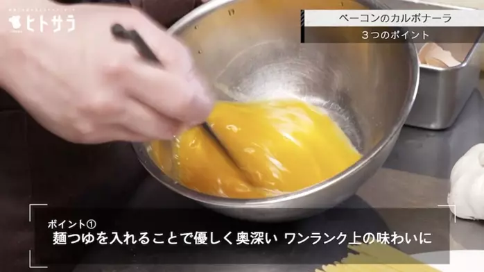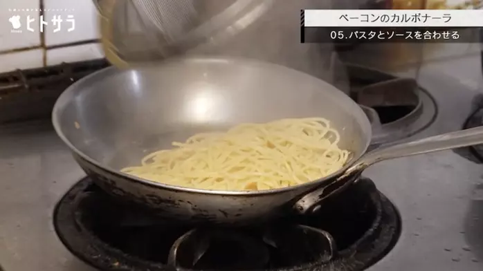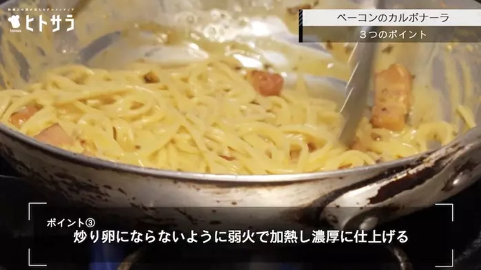 ひと手間加えるだけで一段とおいしくなる【カルボナーラ専門店ハセガワ】の『ベーコンのカルボナーラ』のつくり方|「一流シェフのヒトサラレシピ」#11