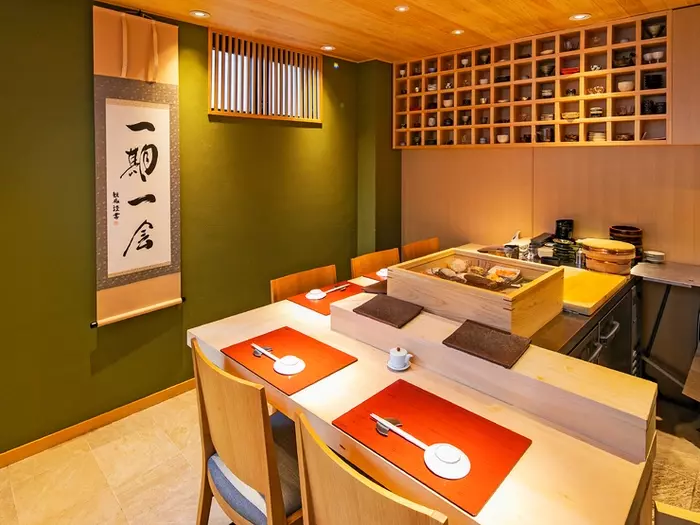 住宅街の一角にひっそりと佇むお店は、隠れ家のような風情。中に入ると、一期一会としたためられた掛け軸が目を引きます。店内はカウンター5席のみ。イチョウの一枚板のカウンターが持つ凛とした美しさは、大人が贅沢な時を過ごすのにふさわしい空間をつくり出しています。4〜6名での利用時には、貸し切りにすることも可能です。