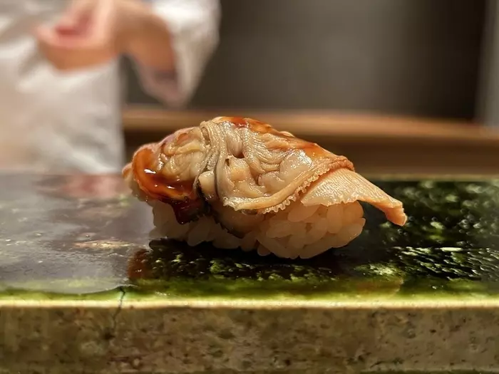 銀座駅から徒歩1分の【鮨ふじおか】は、「味わい、香り、温度などを大切にし、五味のバランスを追求する」がコンセプト。例えば『煮蛤』は、身が固まりだす温度や火入れ時間の研究を重ねてつくり上げた一貫です。