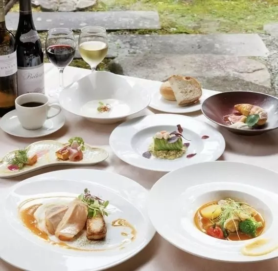 店内には古民家の風情があふれ、日本古来の建築技法が息づくノスタルジックな空間です。日本庭園を眺めながら、地産地消にこだわりシェフ自ら厳選した旬の地野菜を心ゆくまで堪能できます。