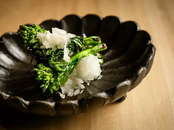 季節の野菜も大切にする食材の一つ。炭火で軽く炙った菜の花に大根を粗くおろした鬼おろしと自家製煎り酒を混ぜたものをかけて、さっぱりとした口直しとして提供しています。野菜はなるべく有機野菜を使い、コースにしっかりと織り込んでいます。