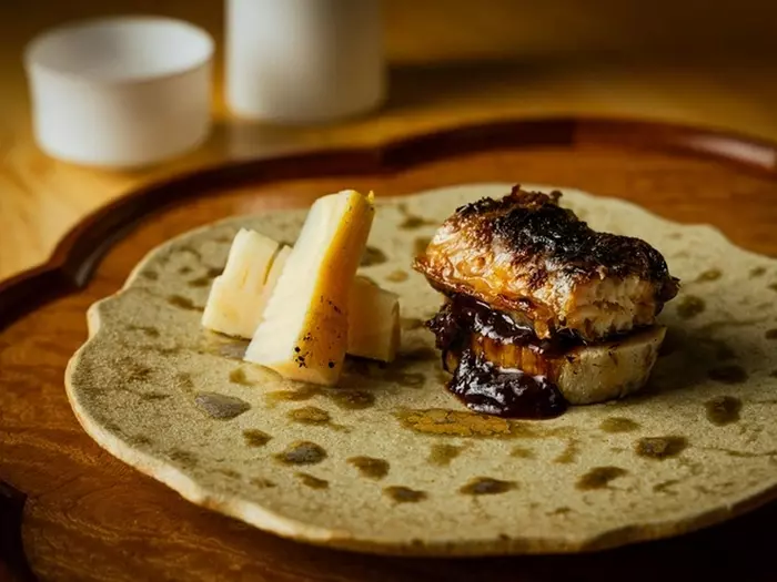 中骨を抜いた鰻を筒切りにし、弱火で5分ほど蒸してから表面がパリッとなるように炭で焼き上げた一品は鰻の脂が全体に行き渡って美味。香ばしい焼き筍と鰻のタレでのばしたフキ味噌と共に味わえば、お酒も進みます。