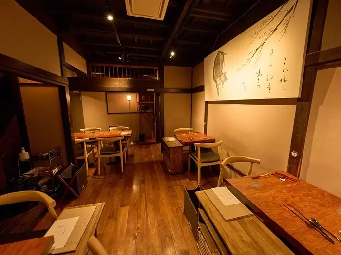 築80年余の古民家を、当時の風情を残しつつリノベーションした店舗。伝統的な趣と現代のモダンさが融合した空間は、オシャレでありつつ心安らぐ雰囲気です。木のぬくもりを感じるテーブル席やカウンター席に加え、屋根裏には坪庭付きの個室も完備。プライベート感たっぷりで、大切な人と特別なひとときを過ごせます。