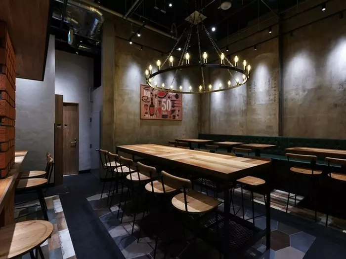新宿三丁目駅より徒歩1分、上質なお肉とワインが楽しめる店です。ネオンが輝くワクワクする入り口を入り地下に降りると、コンクリートと木目が基調の隠れ家のような空間が広がります。高い天井とシャンデリアもオシャレな雰囲気で、カウンター席やソファー席、個室などがあります。