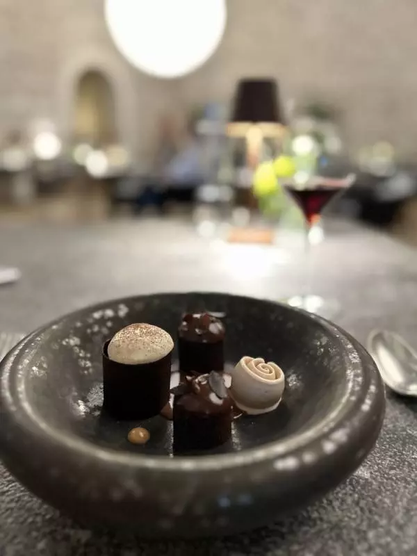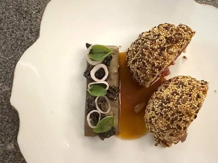 そしてメインはシリアルクラストでくるんだ鳩とフォアグラ、野生きのこ添え。伝統的な料理「鳩のパイ包み」をシェフがアレンジしたものです。ロッシーニ的な重厚感とジビエ感もあって、なかなかすごい料理です。