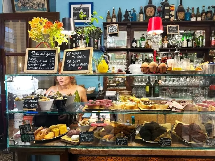 着いた日はまず少し街歩きをし、夕方のアペリティーボ【Caffe-Vini Emilio Ranzini】からスタート、有名なチーズ店【Latteria Bera】で試食して、レストランへ向かいます。