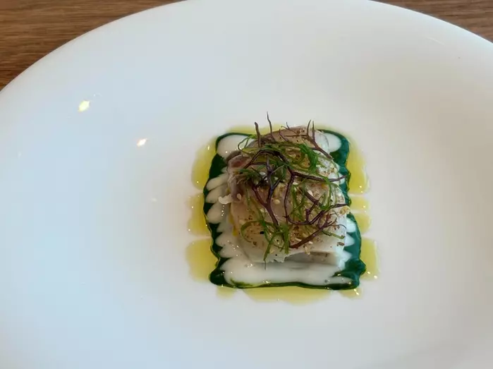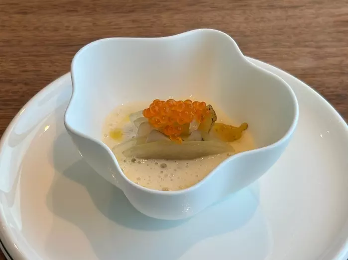 席に着き、最初に供される『とうもろこしのブルーテ』は、朝採りのとうもろこしを滑らかなポタージュのようにし、香ばしい焼きとうもろこしやクルミ、ジャスミンのジュレをプラスした一品。上部にはアーモンドミルクの泡とジャスミン茶のパウダーやライムの皮を添えて。暑い日に身体にスッと染み入るようなアミューズ ブーシュです。