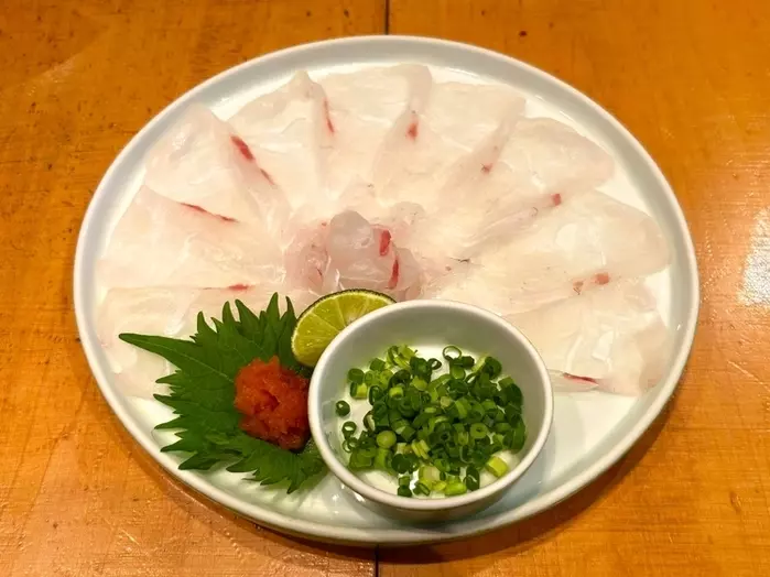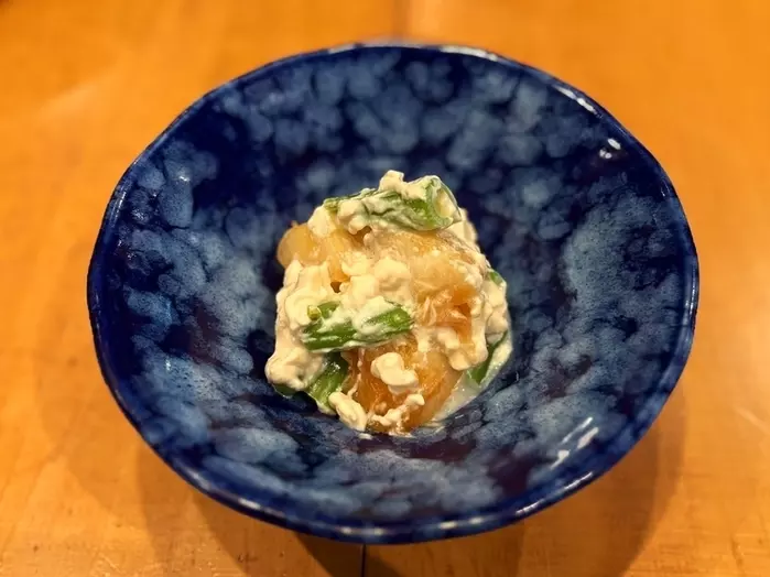 上品な旨みを持つ天然鯛の魅力を最大限に引き出した一皿です。新鮮な鯛の身を極薄に引き、口に含むとふわりととろけ、日本酒にもよく合います