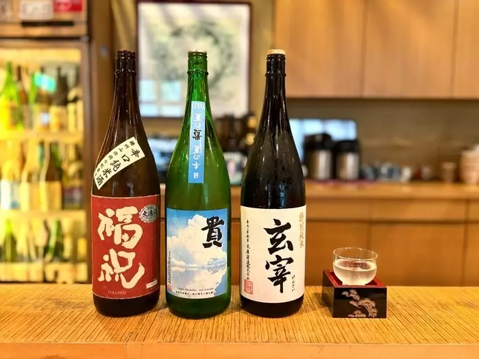 日本酒は、全国各地の蔵元から厳選し、常時60種類以上を取り揃え。名の知れた銘酒から流通の少ない珍しい酒まで、バリエーション豊かなラインアップが魅力です