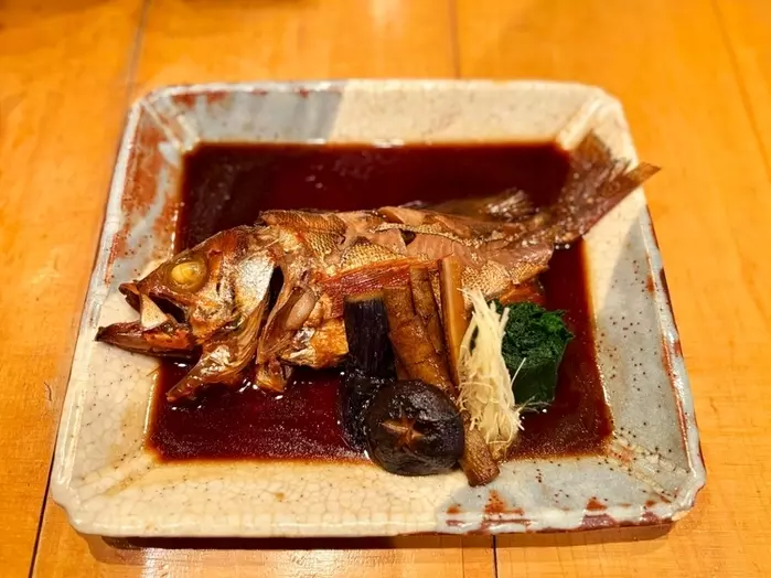 注文を受けてからにじっくり煮上げる【笹吟』定番の煮付。ふっくらとした身はもちろん、椎茸やごぼうなどの付け合わせまで絶品。気づけばお酒がなくなる魔法のような一皿です