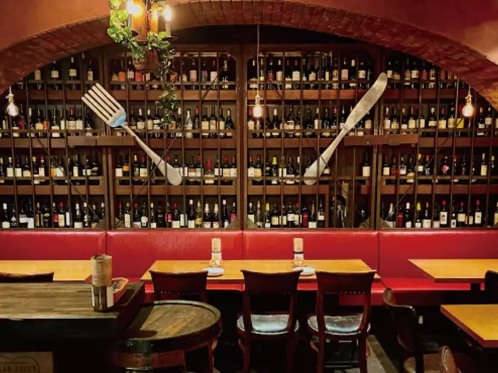 表参道駅より徒歩2分、青山通り沿いの肉バル。壁一面にワインが並んだ店内は、どこか異国の酒場のよう。