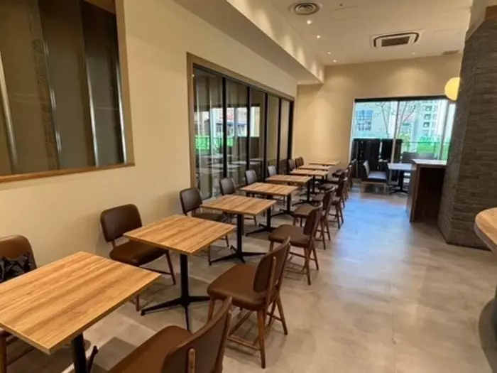 壁一面に窓を配した、明るく開放的な店内。モダンな雰囲気に包まれながら、ゆったり落ち着いて過ごすことができます。