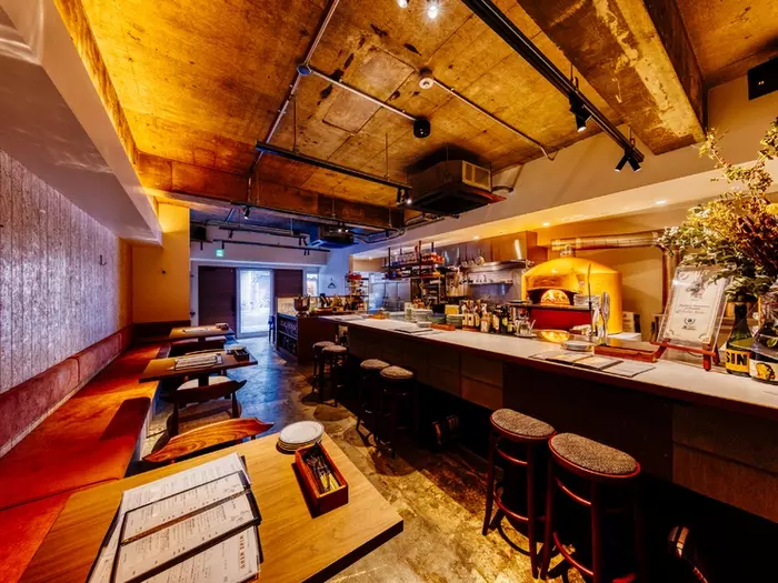 扉を開けると、目の前に広がるのはオレンジ色のピザ窯が目をひく落ち着いた空間。ピザが焼き上がる様子を間近で体感できるカウンター席に加え、スタイリッシュな印象のテーブル席も用意されています。なにわ伝統野菜など関西圏の食材を主軸にした料理を、ボトルはもちろんグラスでも楽しめる多彩なワインとともに味わってみてください。