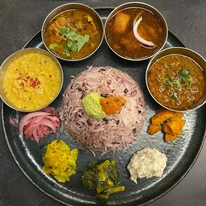 旬や季節に合わせて内容が変わる『4種のカレー』1,800円。この日は左から「パリップ」「レモンチキン」「スリランカポーク」「スマトラキーマ」