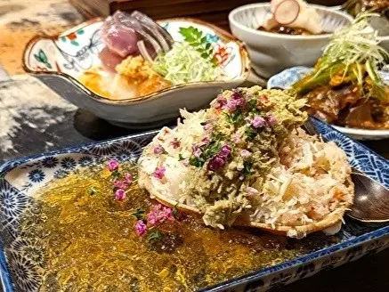 また野菜だけではなく、海の幸も取り入れた特別感のあるメニューも。『ズワイガニ 甲羅詰め』は、繊細な甘みと上品な旨みが特徴のズワイガニの身を、甲羅いっぱいに詰めた贅沢な一皿。日本酒との相性も抜群で、一口ごとに蟹の旨みが感じられます。『岩牡蠣と谷中生姜 天ぷら』は、サクッと揚げた衣の中から海のミルクと呼ばれる岩牡蠣の濃厚な旨みと、生姜の清涼感ある風味が広がります。
