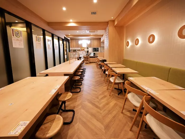 農業をイメージしているという緑を基調にした店内には、ソファ席やカウンター席など40席ほどを用意。木のぬくもりを感じられる空間の中、誰と訪れてもリラックスして食事を楽しめます。テイクアウトもできるので、公園など屋外で名古屋の風景を眺めながら味わうのもオススメです。