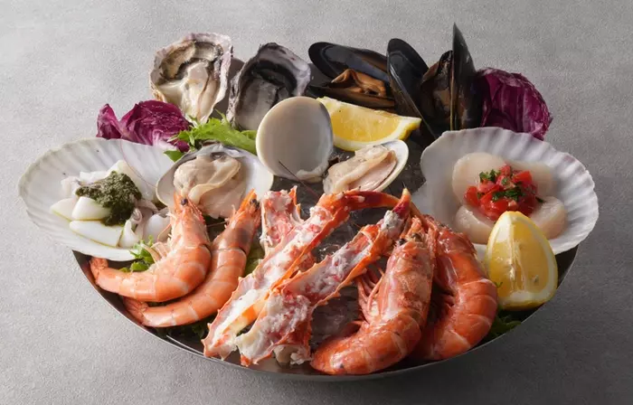 Mサイズ 9,800円~(2名様~)/イカ、蛤、ホタテ、タラバ蟹、生牡蠣など、豪華海の幸を宝石のように盛り付けた華やかな一皿