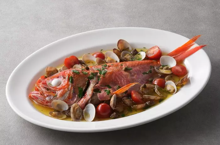 7,900円/相模湾で獲れた鮮魚を丸ごと使い、トマトやあさりと煮込んだ南イタリアの郷土料理。旨味が溶け込んだスープも絶品