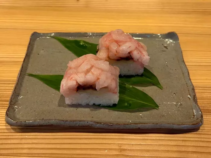 三国港で水揚げされた生の「甘えび」を贅沢に使用。濃厚な甘えびの旨みに、ガリの爽やかな風味と醤油の塩味が調和した押しずしです。