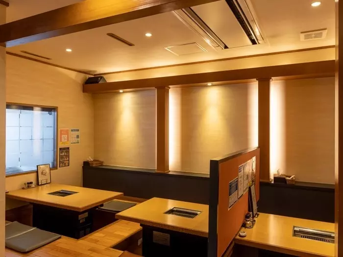 家族の食事会やビジネスの会食、大人デートまで、幅広いシーンで利用できる焼肉店。店内は全席掘りごたつ式の席で、各席のスペースを広めに設けているため、のびのびと過ごすことができます。
