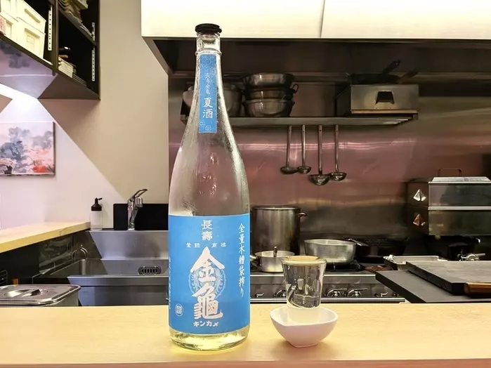 最初の『前菜6種盛り合わせ』にオススメして頂いた、金亀シリーズの「夏酒」。季節に合わせたお酒が楽しめるのも、毎月新たなラインアップを取り入れている同店ならでは