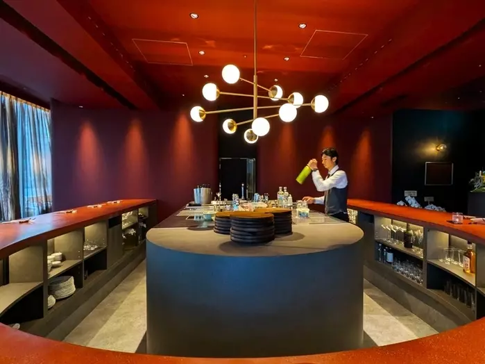 扉を開けた先に広がるのは、シックなトーンのエンジ色が印象的なスタイリッシュ空間。そして、よくバーと聞くと連想するような「一列に並ぶカウンター席とバックバーにずらりと並んだボトル」のイメージを爽やかにかっさらってくれる、全体を見渡せる開けた視界・曲線を描いたカウンター席・バックバーを設けず、あえて作業スペースを全てさらけ出した造り……。