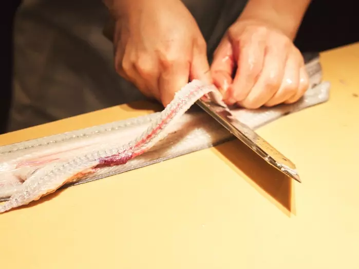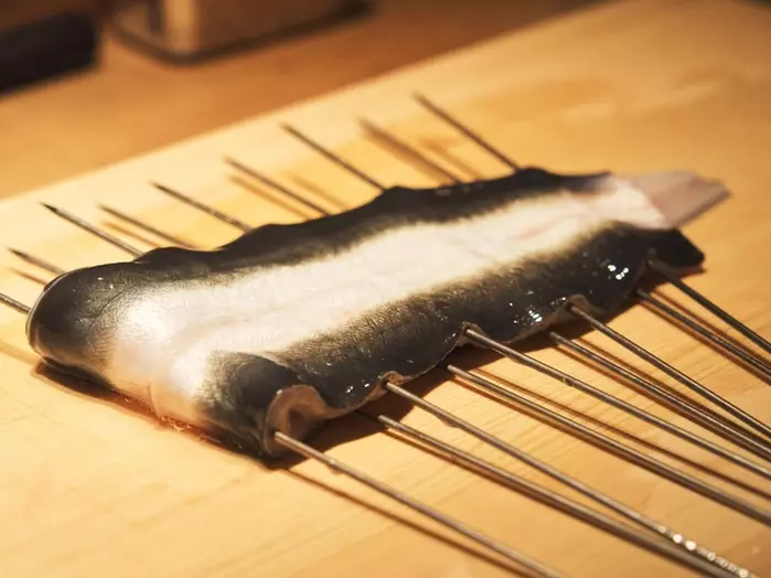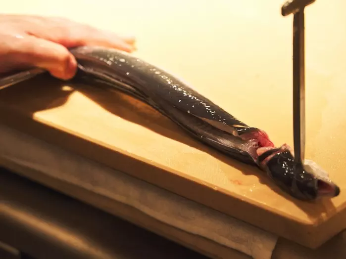 活きのいい鰻を目打ちにしてまな板に固定し、背開きにする