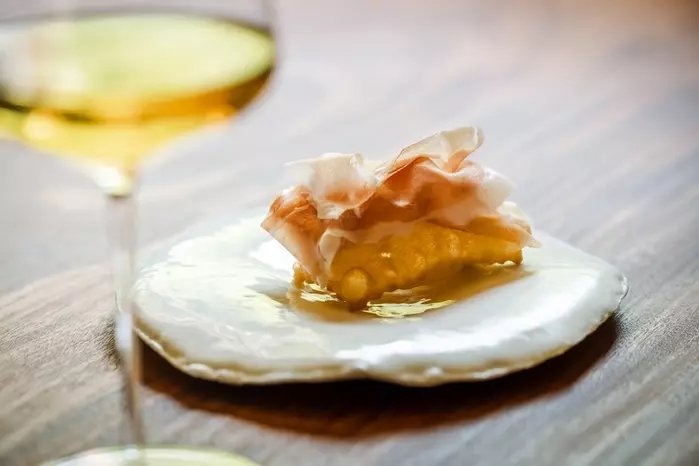 熱々の揚げパンの上に薄くスライスした【ボッテガ パルコフィエラ】の生ハムをのせた『トルタフリッタ』。1,760円