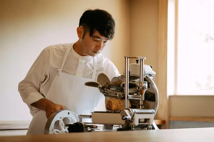 「中條さんが熱意と愛情を持って丁寧につくっている話を聞き、できるだけベストの状態でお客様に感動を伝えたいと思いました。感謝の思いを込めて1枚1枚丁寧にスライスさせていただいています」と話す望月シェフ。