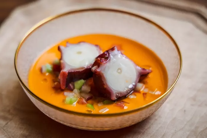 真夏の一品『長谷川さんから届いた佐島産真蛸と鎌倉野菜のガスパチョ仕立て』。時価