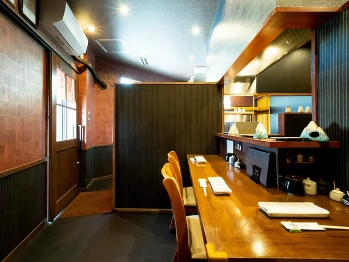 落ち着いた和の雰囲気が心地よい、こじんまりとした店内。テーブル席は、周りに気兼ねなく過ごせる半個室の座席になっています。店主との会話を楽しみながら食事ができるカウンター席もあり、少人数での利用にも適した空間。ソムリエ厳選のワインに加え、焼酎・日本酒・カクテルのラインナップが豊富なのもうれしい限りです。