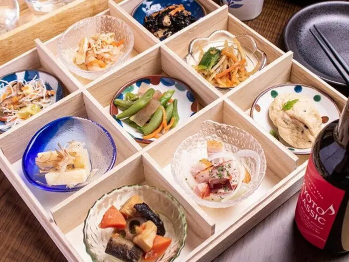 京野菜や豆腐、湯葉など、京都ならではの食材を使った、さまざまな京料理を味わえます。名物の『おばんざい9種盛合せ』は、お酒に合うようにアレンジした昔ながらのおばんざいを、少しずつ盛合わせた一品。目でも舌でも楽しめます。甘口・辛口14種を用意する地酒から好みのものを選ぶ『利き酒三種』も見逃せません。