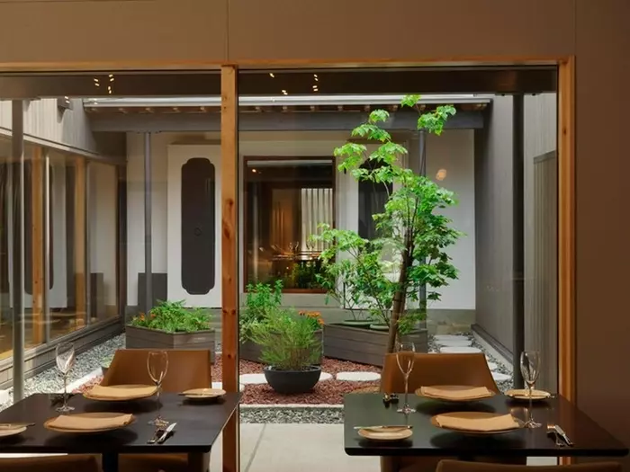 手入れの行き届いた中庭を眺めながら食事ができるテーブル席