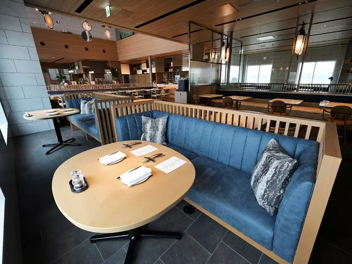 大きな窓から、福井の町並みや日本百名山の荒島岳や白山が望める絶好のロケーション。開放感あふれる店内は、福井県の伝統とシックなデザインが調和した空間となっています。景色を眺めながら食事ができるカウンター席や、ゆったりしたテーブル席、ソファーが優しく体を包み込んでくれるカップルシートも用意されています。