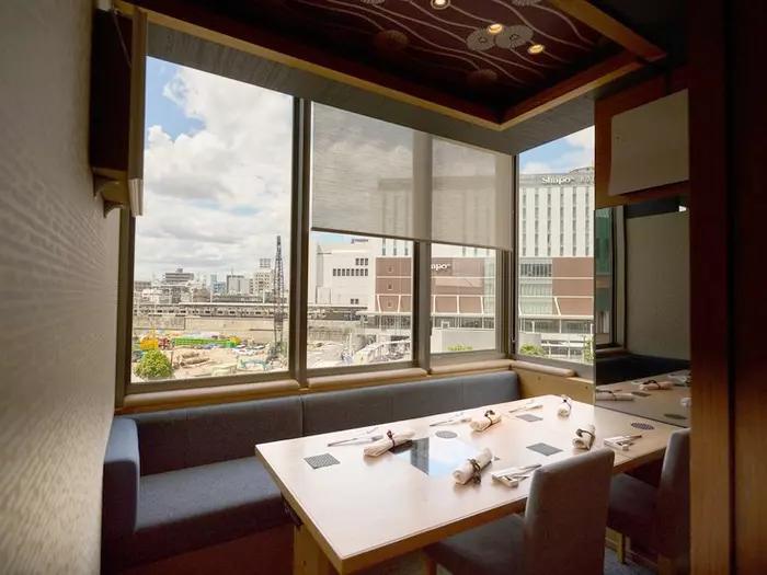 お店は利便性のいい駅からすぐの場所。窓からは駅前の賑わいが眺められます。店内はゆったりくつろげる落ち着いた雰囲気。引き戸で仕切る完全個室は、気の合う仲間との会食や、特別な日の食事にぴったり。常時10~15種類が揃う店主が厳選する日本酒を酌み交わしながら、贅沢なひとときが過ごせるお店です。